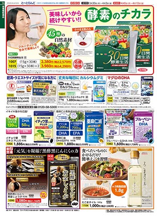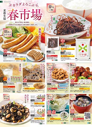 翌週供給衛生・口腔ケア、栄養補助食品や美粧を掲載、毎週4ページでご案内しています。「有機大麦若葉青汁」「密毛ハブラシ」の東都生協オリジナル商品もあります。