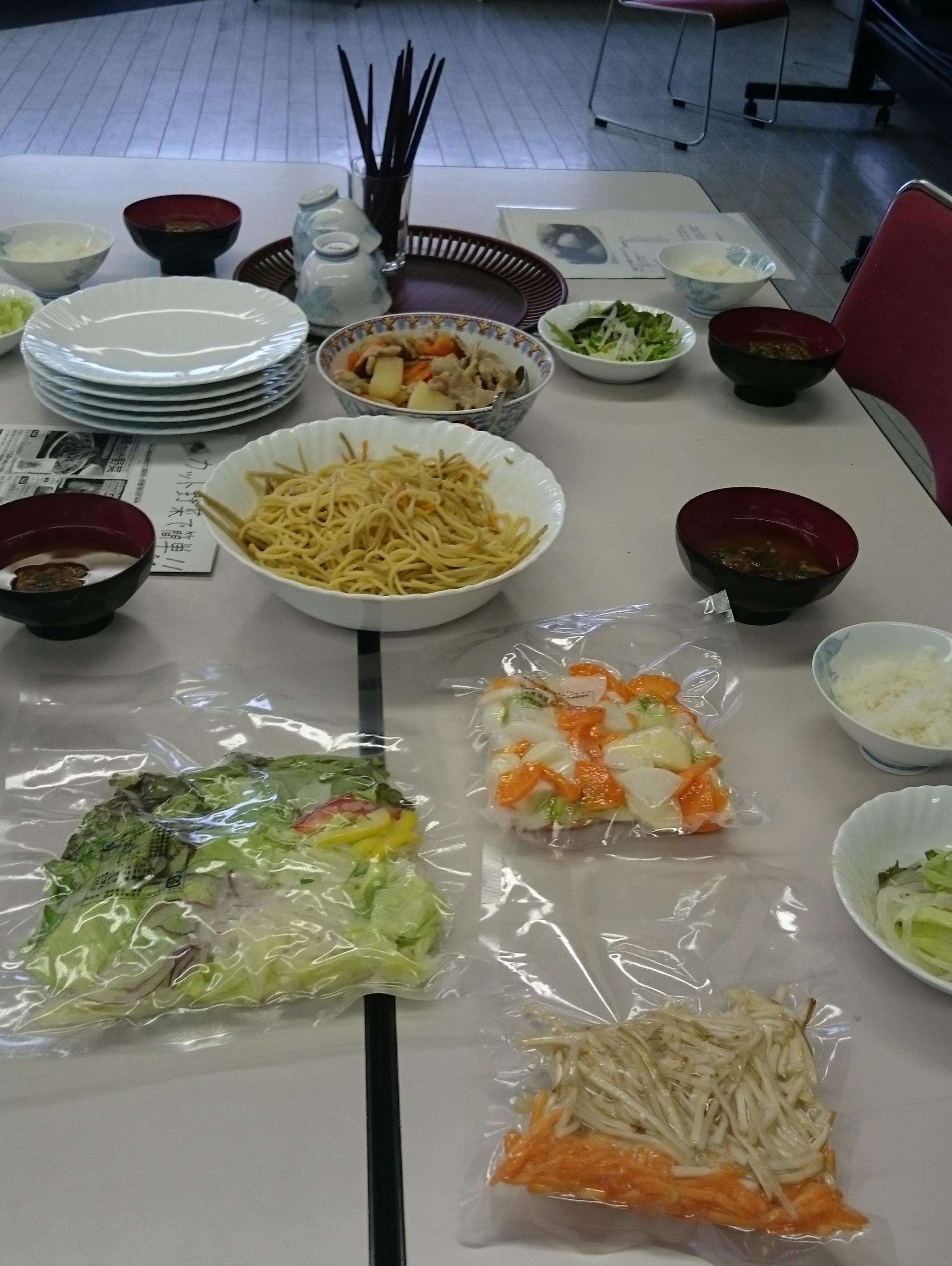 カット野菜をバターで炒め、ゆでたパスタと東都つゆを加えて絡ませた「焦がしバターしょうゆのきんぴら風パスタ」、カット野菜と豚肉を煮込む豚汁に挑戦。