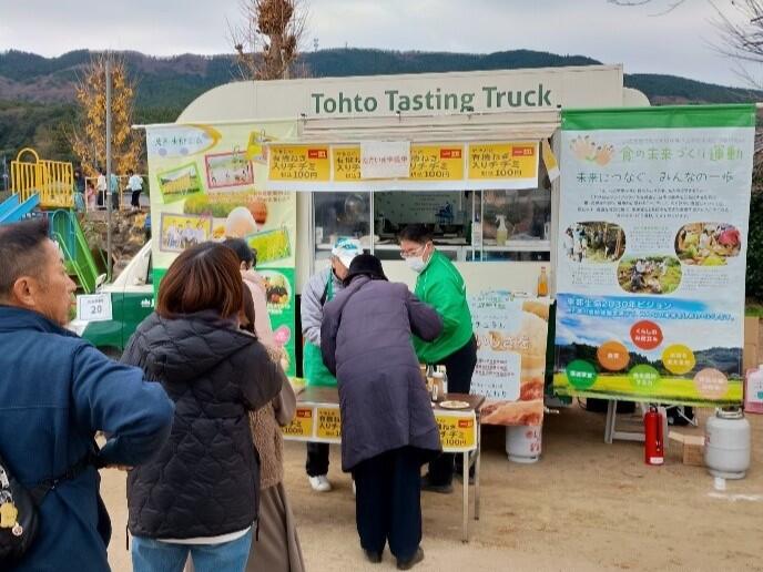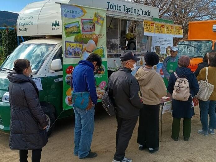 地元産の有機食材を扱ったさまざまな店舗が立ち並ぶ中、東都生協は試食イベント車で「やさと有機ねぎ入りチヂミ」を販売しました。