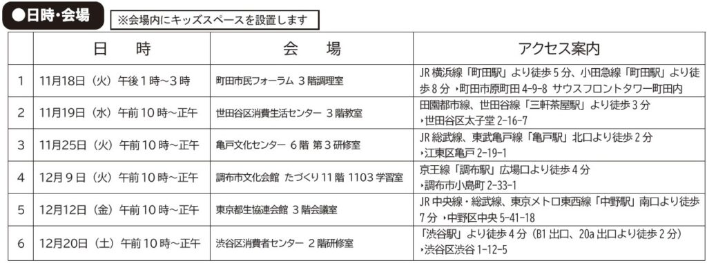 町田市民フォーラム 3階調理室・世田谷区消費生活センター 3階教室・亀戸文化センター 6階 第3研修室・調布市文化会館 たづくり11階 1103学習室・東京都生協連会館 3階会議室・渋谷区消費者センター 2階研修室