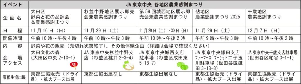 - 【千歳地区秋季農産物品評会】11月13日(木)観覧:午前9時~展示/展示即売:正午~、【砧地区秋季農産物品評会・展示即売会】11月15日(土)観覧:午前9時~/展示即売:午前11時~、【大田区野菜と花の品評会&農業感謝まつり】11月16日(日)午前10時~午後4時、【杉並中野地区展示即売会兼農業感謝まつり】11月29日(土)午前10時~午後3 時、【第59回城西地区展示即売会兼農業感謝まつり】11月29日(土)・30日(日)午前10時~午後2時、【砧地区農業感謝まつり2025】11月29日(土)午前9時~午後3時、【千歳地区農業感謝まつり】12月7日(日)午前10時~午後2時