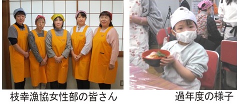 枝幸の「海鮮丼」を盛り付け、「ちゃんちゃん焼き」や新商品の試食も交えながら、枝幸漁協女性部と交流します。