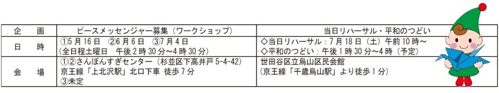 日時:ピースメッセンジャー募集(ワークショップ)①5月16日 ②6月6日 ③7月4日 (全日程土曜日 午後2時30分~4時30分)