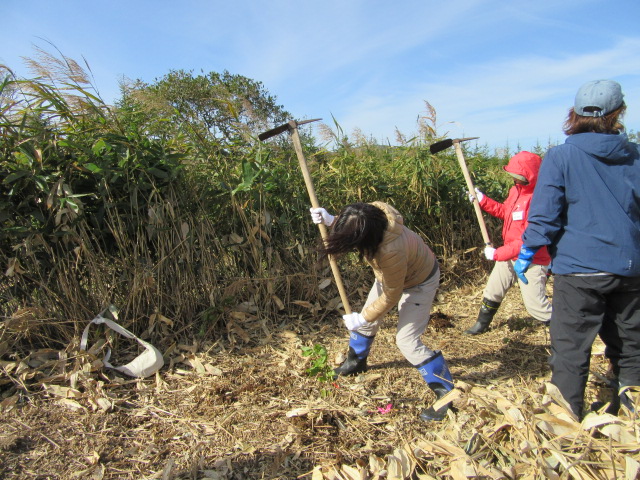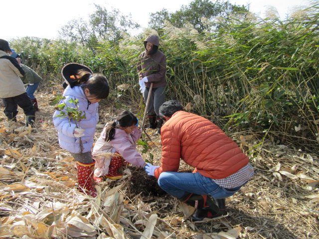 植樹は鍬で穴を掘った後、木の苗(はんのき)と肥料を入れて足で踏み固める作業です。