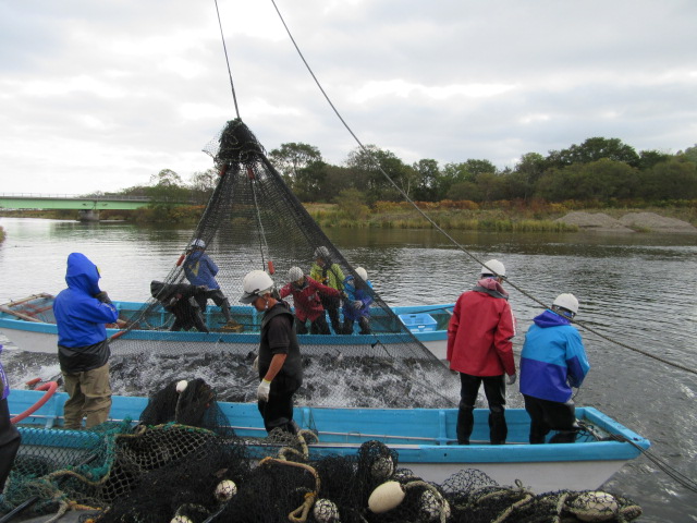 秋鮭の陸揚げと漁協市場の見学の予定でしたが、海がしけていて残念ながら見学はできませんでしたが、千畳岩を見学し朝食後、徳志別川さけ・ます捕獲場見学。