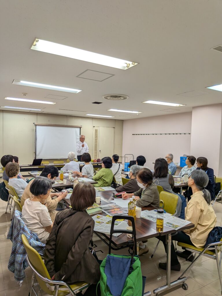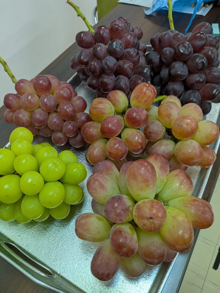 ㈲山形南陽のんのん俱楽部の鈴木秀男さんをお招きして、対話形式でお話を進めながら、シャインマスカットとシャインマスカットとのかけ合わせの新種、計4種類のぶどうをいただきました。