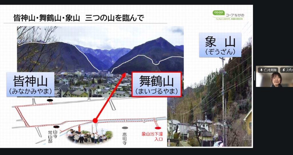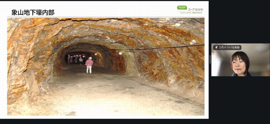 戦後80年が過ぎた今も全国には戦跡が数多く残されています。今回は長野市に残る「松代大本営」についてコープながの組合理事を講師にお招きしオンラインで学びました。