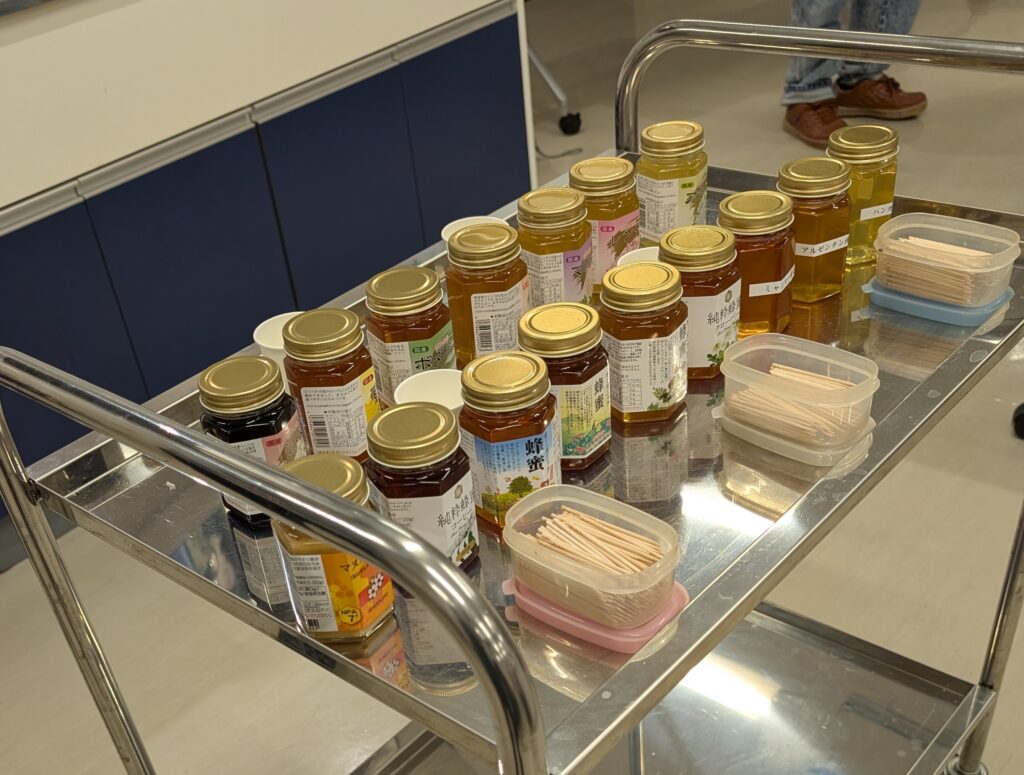「わたしのこだわり」商品を含む約20種類のはちみつの食べ比べと、はちみつを使用した料理を試食しました。温暖化や環境悪化等の影響でミツバチが激減し、果樹や野菜の生産にも大きく影響していることも知りました。