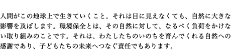 現状の社会を昔に戻せとは言いません。けれど、自然環境は人間だけのものではありません。「手のひらを太陽に」ではありませんが、みみずだって、あめんぼうだってみんな生きているのです。次の代にきれいな自然を渡す義務が私たちにはあります。