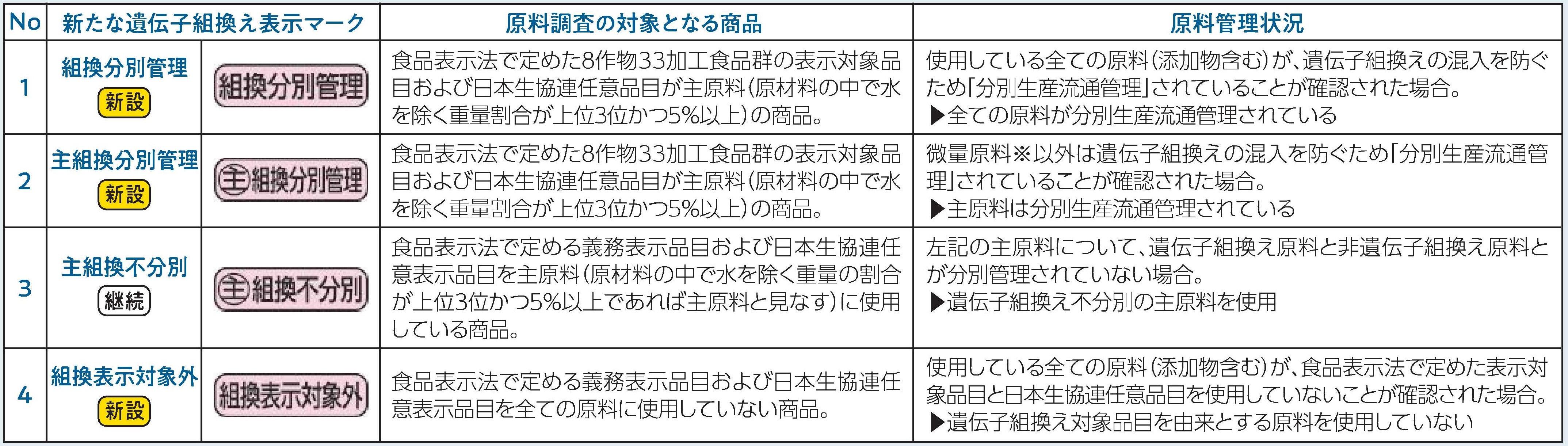 「新たな遺伝子組換え表示マーク」は以下の4つ